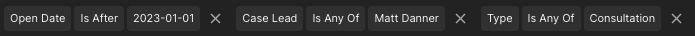 "Show me all cases WHERE the open date is after January 1, 2023 AND the case lead is Matt Danner AND the case type is Consultation."